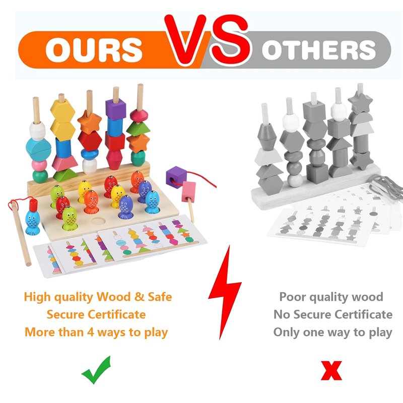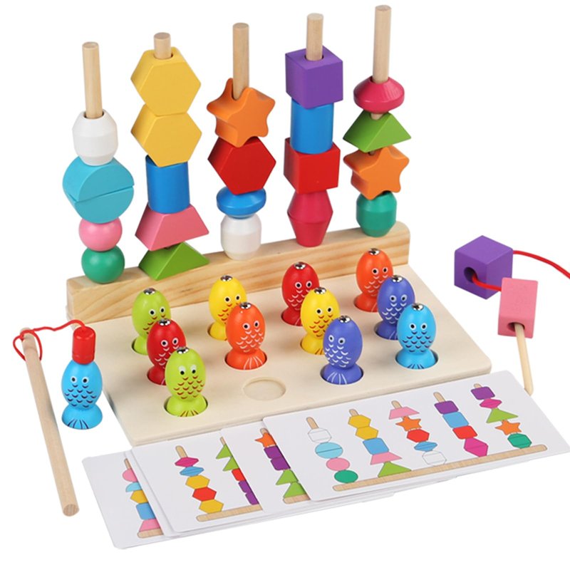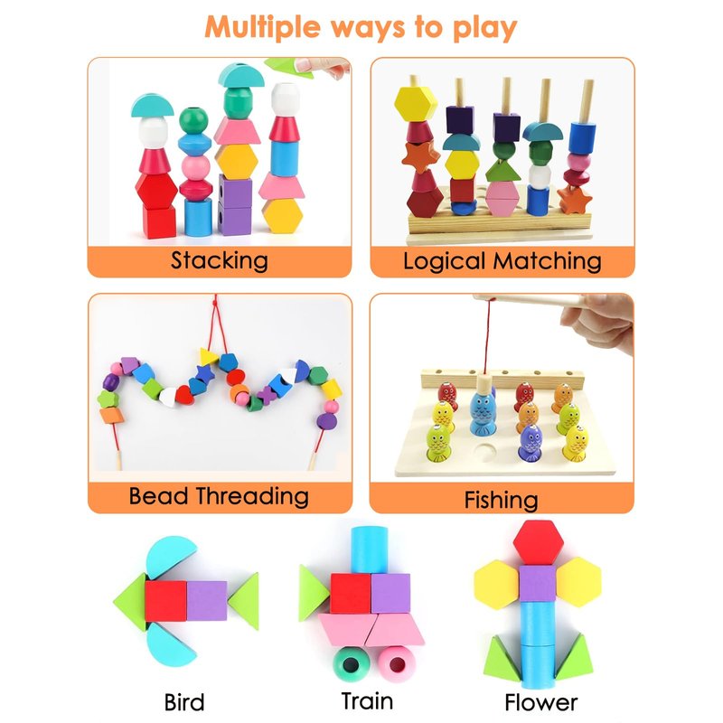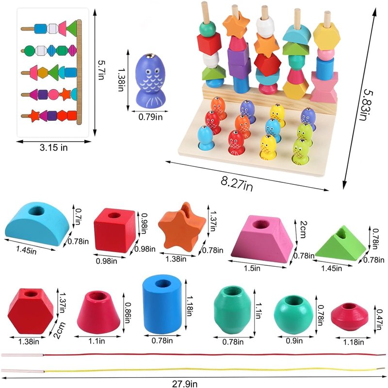- VERSATILE PLAY, HOLISTIC DEVELOPMENT - Kids stack blocks in fun patterns by cards' bead guides or thread beads with shoelaces for unique trinkets. It's play that strengthens hand-eye coordination and fine motor skills. Catching fish with a wooden pole builds patience and focus. Plus, colors, shapes, and more educational fun keep 3-5-year-olds learning and growing while they play