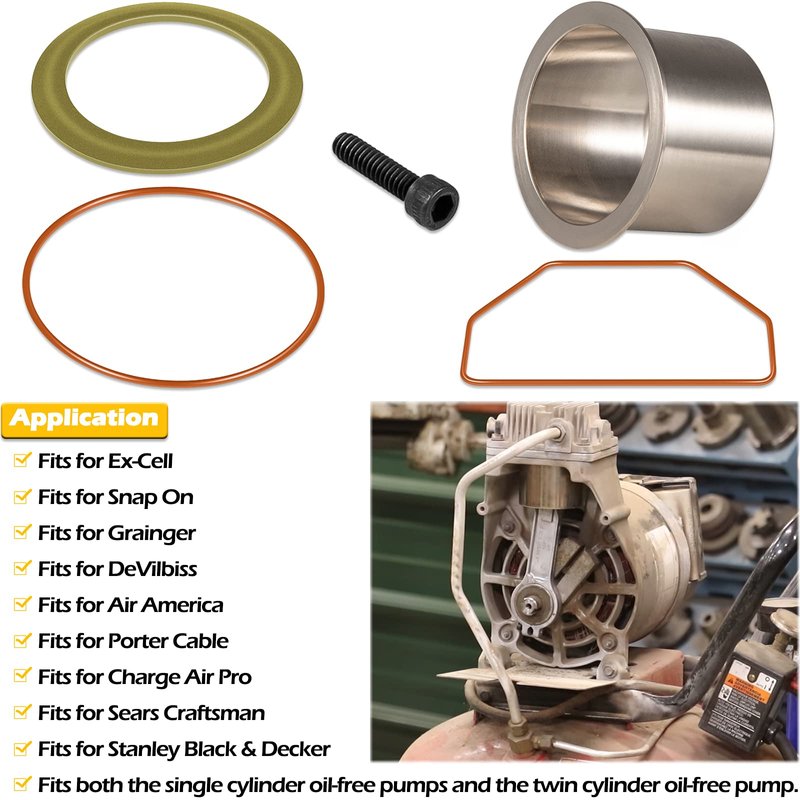 - 【Package Includes】This Compression Ring Kit contains 5 parts: 1 x D25837 Coated Cylinder Sleeve, 1 x DAC-308 Coated Oil Free Piston Ring, 1 x SSF-3158-1 Piston Rod Cap Screw, 1 x SSG-8156 Valve Plate to Cylinder Sleeve O-Ring, 1 x ACG-45 Cylinder head to Valve Plate O-Ring.