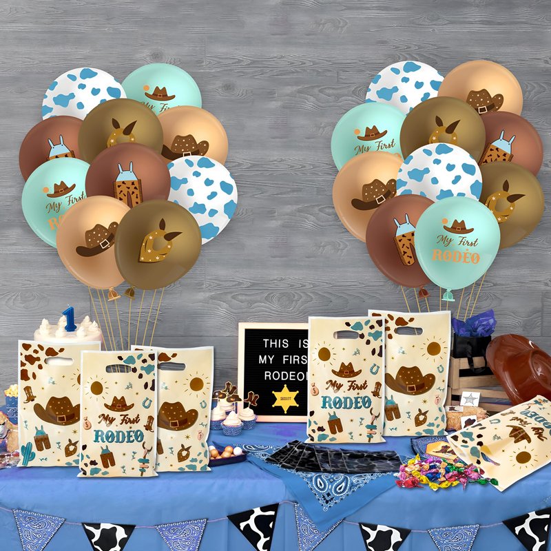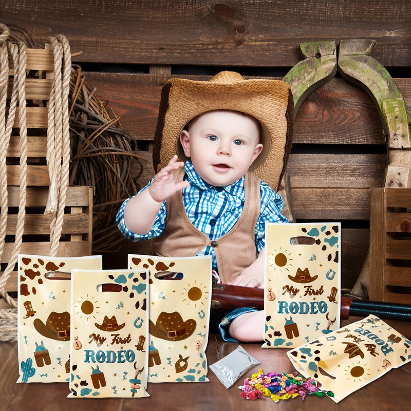 - Blue Cowboy 1st Plastic Gift Bag: Celebrate a "My First Rodeo" with these blue Cowboy 1st plastic gift bags. Ideal for commemorating a special occasion, they add a personalized touch to your party favors.
