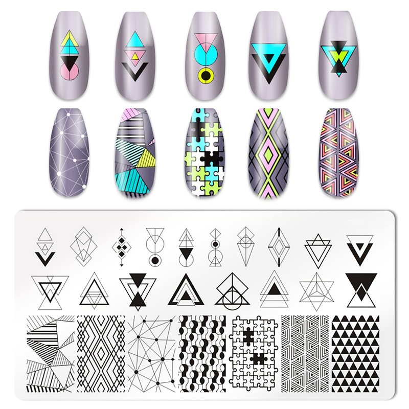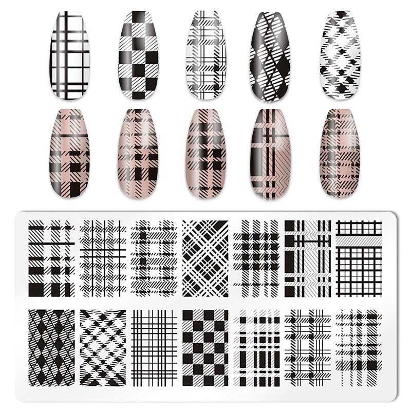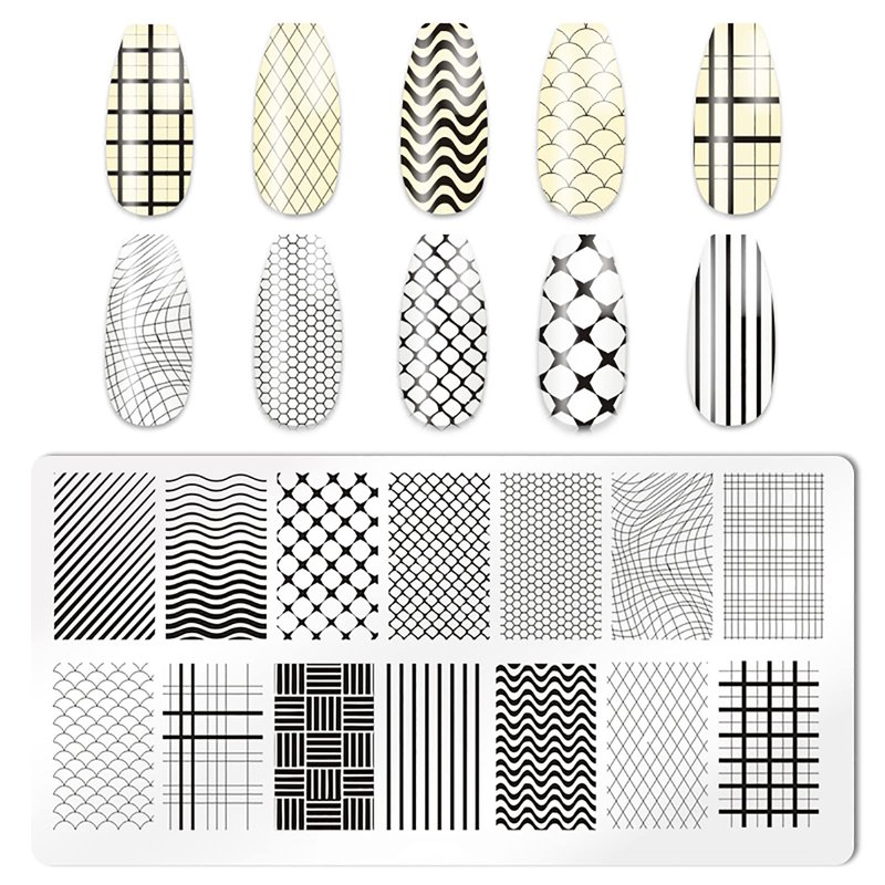 - Valuable Package: you will receive 5pcs nail stamping kit, 1 nail stamper, 2 scraper, the nail template includes in the pattern of geometry design, plaid, chessboard, etc. It is made of 304 stainless steel, thickness enough to ensure will not bend;measuring about 2.4*4.7 inches.