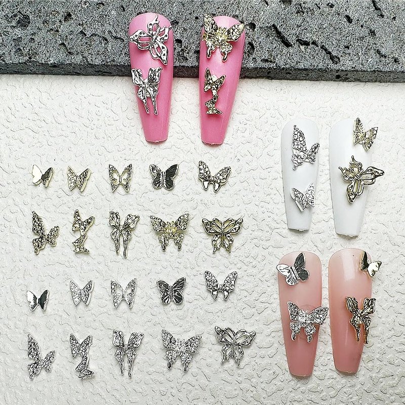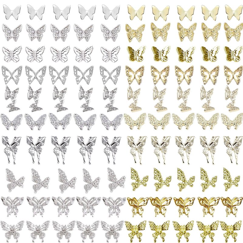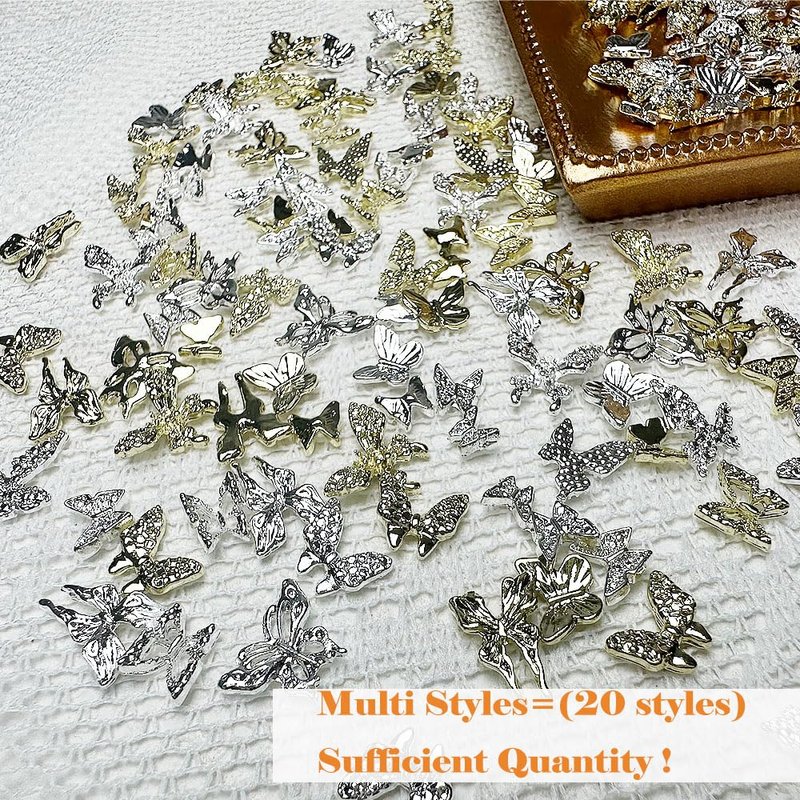 - 【100 PCS Butterfly Nail Charms Sets】Package includes 100 pcs alloy silver and gold butterfly nail charms (20 styles,each style 5 pcs) ,Sufficient quantity and rich styles can meet your various needs in DIY nail art or any other handmade projects!