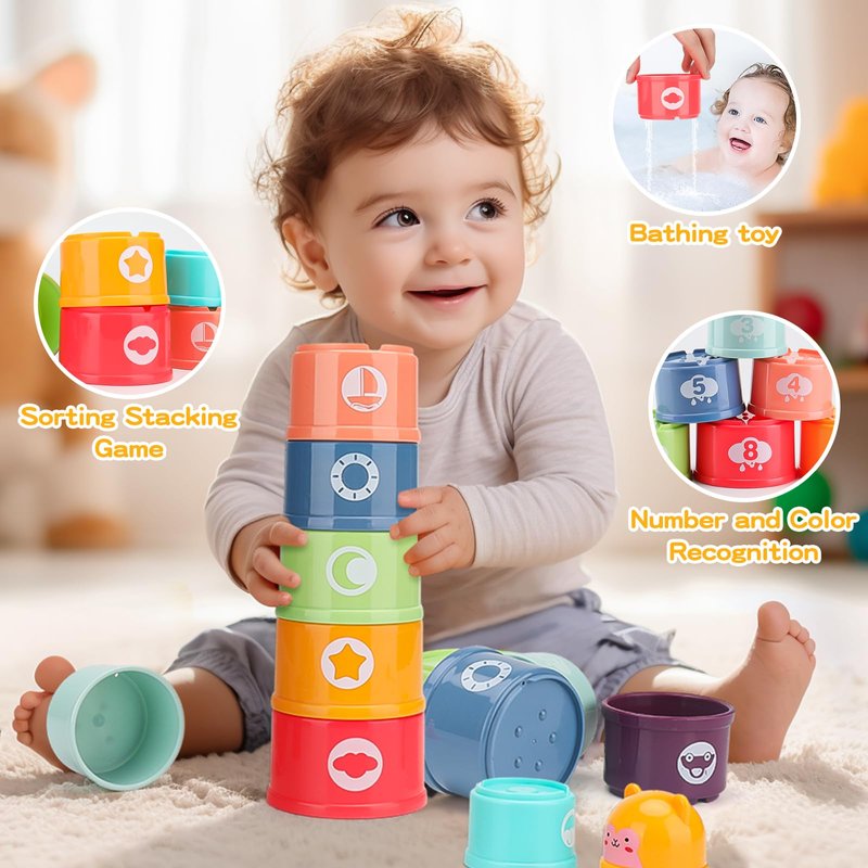 - Stacking Cups Bath Toy: Baby stacking cup educational toys set for baby 6 month old includes 9 colorful nesting cups, painted with cartoon numbers and cute patterns. Fine hand movements by stacking, sorting, nesting early learning toys for infants toddlers.