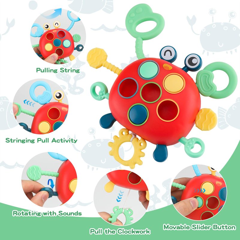 - Pull String Crab Montessori Toys: Made of Silicone and abs, this baby crab sensory toy is designed for fine baby's motor skills. 3 slidable press buttons to exercise baby's hand-eye coordination. Pull string teether arm makes teething gum more comfortable. Pull up and down the hook to make sounds and wiggle eyes of crab toy.
