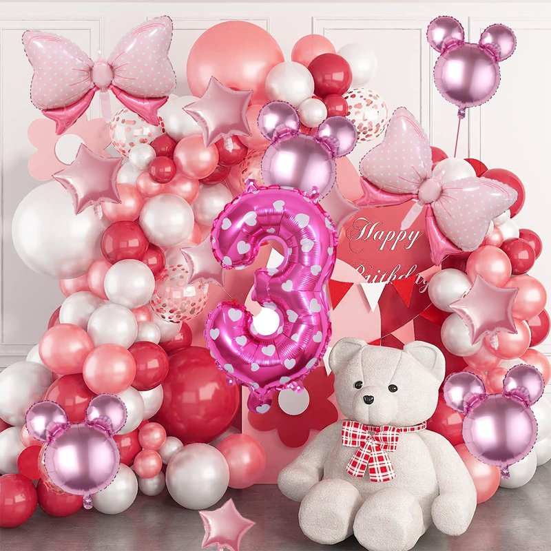 - 【Great for photos】You can use glue dots and ribbons to attach the pink mouse balloons and number balloons together. The different size balloons will provide more layers to the garland and create a wonderful party scene. The pink mini mouse birthday decorations are a great backdrop for photos and perfect party decorations