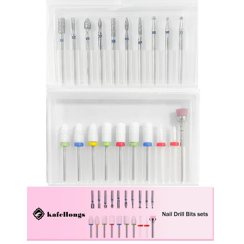 Kafellongls 20pcs Nail Drill Bits Sets, 3/32-inch Diamond Cuticle Electric Nail File and Ceramic Acrylic Gel Nail Bit Kit, Acrylic Nail Art Tools, Carbide Cuticle Remover Bits for Manicure Pedicure