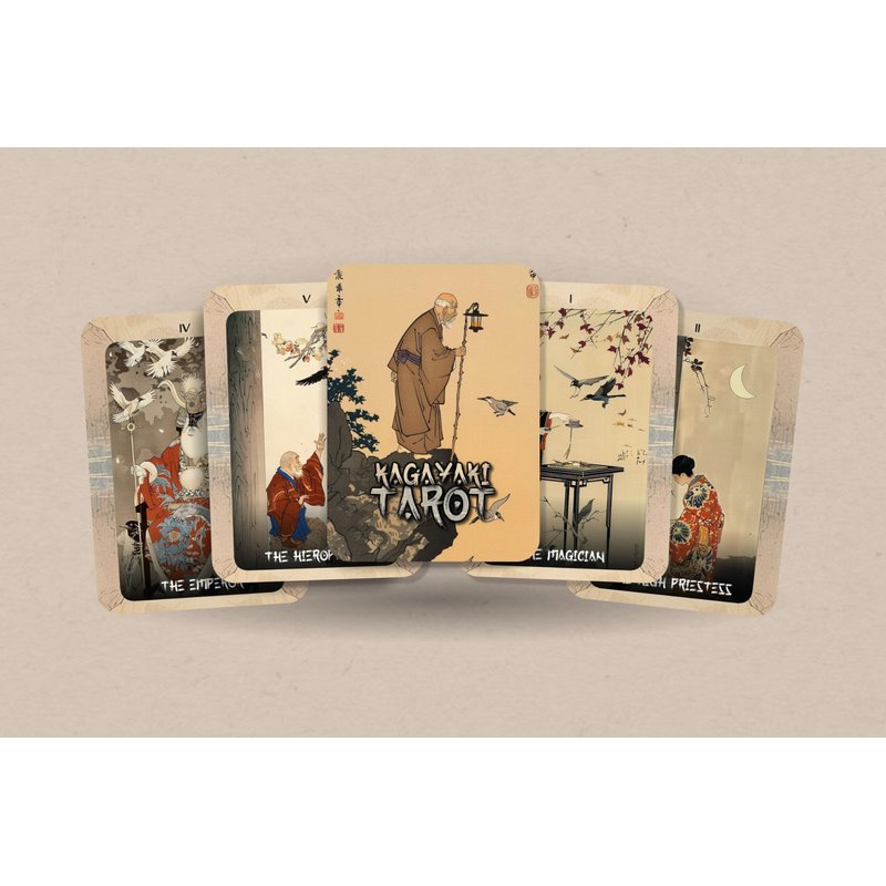 The word "Kagayaki" means "radiance" or "brilliance" in Japanese, reflecting the luminous quality of the artwork in this deck. Each card is a unique fusion, featuring delicate depictions of flora and fauna alongside the rich, esoteric imagery of traditional tarot.