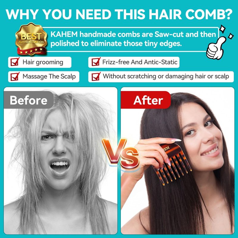 - 【Premium Quality】Kahem handmade combs are Saw-cut and then polished to eliminate those tiny edges. Made of Sturdy Materia. Safety and Unbreakable Round Teeth is more comfortable without scratching or damaging hair.
