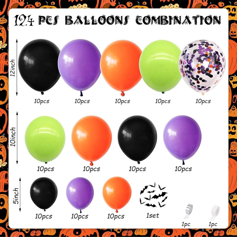 • 🎃HALLOWEEN PARTY BALLOONS GARLAND KIT includes 40pcs 12inch, 40pcs 10inch, 30pcs 5inch(matte black, matte purple, matte orange, fruit green balloons), 10pcs 12inch black orange purple confetti balloons, 1 pack bat stickers, 1pc glue dot, 1pc balloon chain