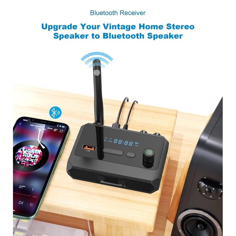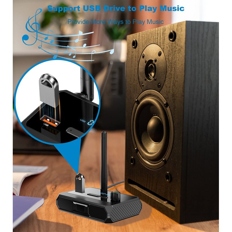 - MULTIFUNCTIONAL INTERFACE: Bluetooth receiver for speakers supports RCA / 3.5mm jack / digital optical outputs, and also supports a USB drive to play music. Which is compatible with 99% of speakers, old AV receivers, car stereos, and home stereos. You can enjoy the music atmosphere anytime and anywhere.
