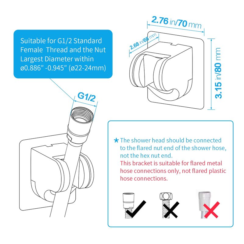 - ►【Multiple Advantages】--Super adhesive, heavy duty, durable, solid, no drill required, no damage to wall surface, waterproof and suitable for most of standard shower head hose. Note: This bracket is suitable for flared metal hose onnections only, not flared plastic hose connections.