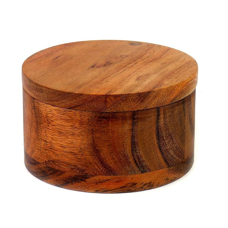 Keep spices stylishly stored with this Acacia Salt Box with Swivel Cover. Crafted of solid acacia wood, it is noted for its durability, sustainability, and gorgeous wood grain. The unique swivel cover allows easy access but offers protection when not in use. Perfect for storing specialty salts, spices or even small household items.