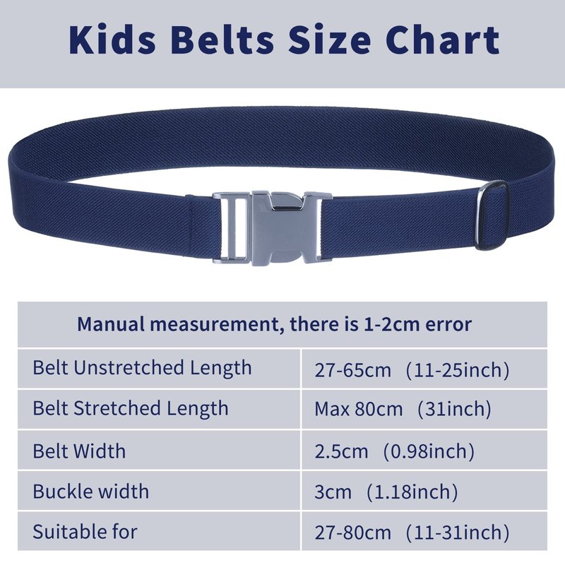 - ADJUSTABLE BELT - The belt size is adjustable and elastic, perfect for boys and girls. One size fits all, just adjust the size to fit your kid waist, from 15.35''/39 cm up to 26.77''/68 cm, belt width: 1''/ 2.5cm, buckle width: 1.2"/3cm(for reference only)