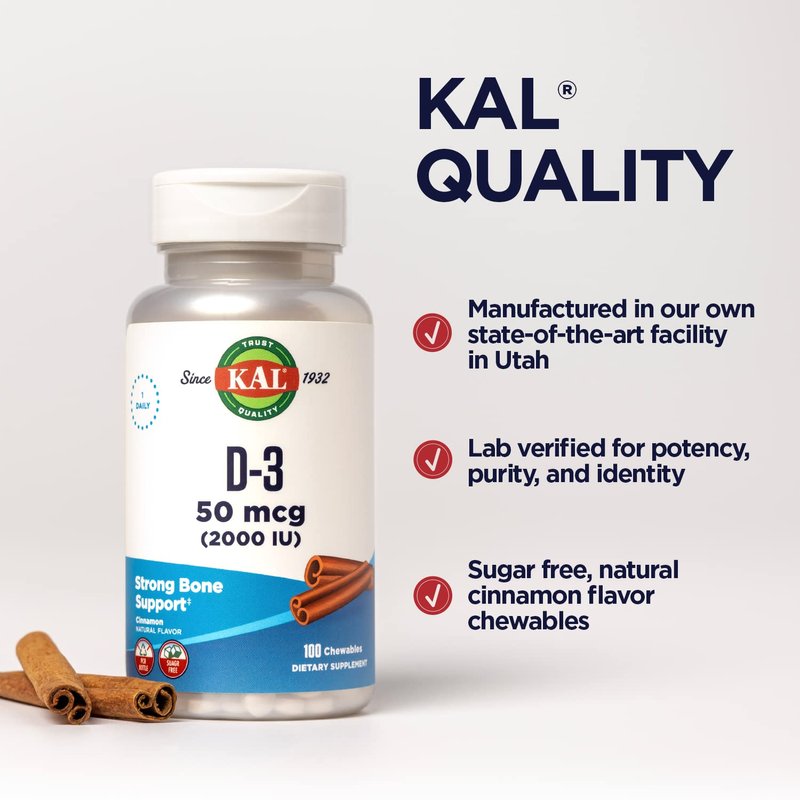 KAL Vitamin D3 Chewables 50 mcg, Vitamin D 2000 IU as Cholecalciferol, Sugar Free, Natural Cinnamon Flavor D3 Vitamin, Immune Support & Bone Health, 100 Servings, 100 Chewables