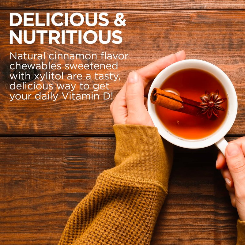 - Potent Chewables: Each D3 Vitamin chewable provides 50 mcg or 2000 IU of Vit D3 in easy-to-take, sugar free, natural cinnamon flavor chewables sweetened with Xylitol.
