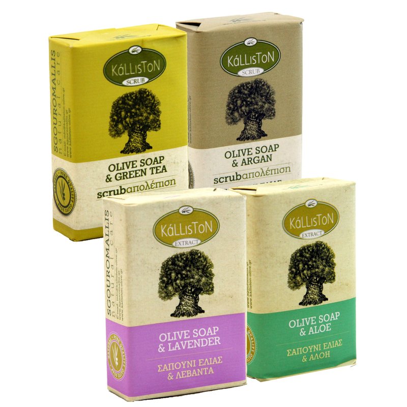 Kalliston, Botanical Collection, Includes Olive Oil Scrubs Green Tea and Argan & Olive Oil Extract Soaps Lavender and Aloe, All Natural, Made in Ancient Crete, Greece, Pack of 4