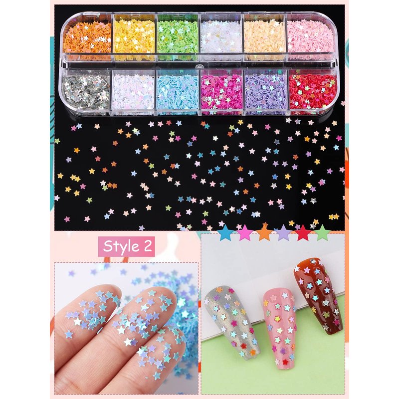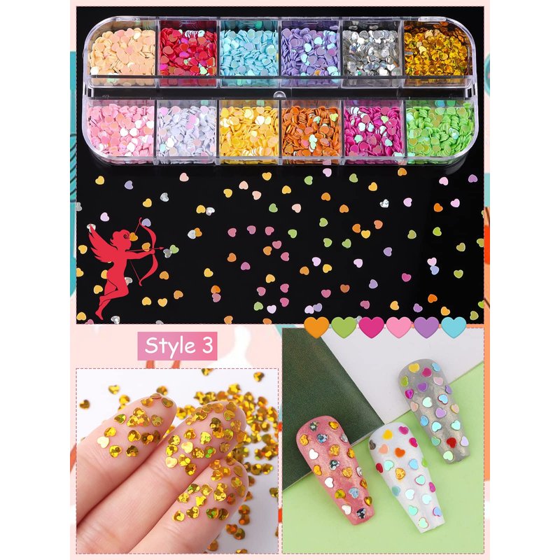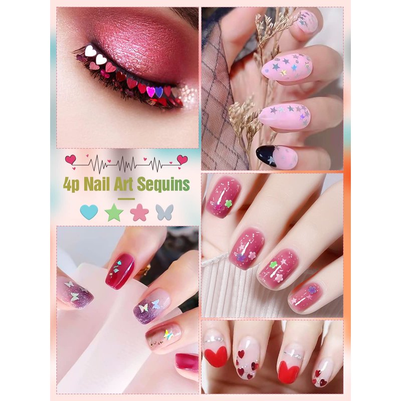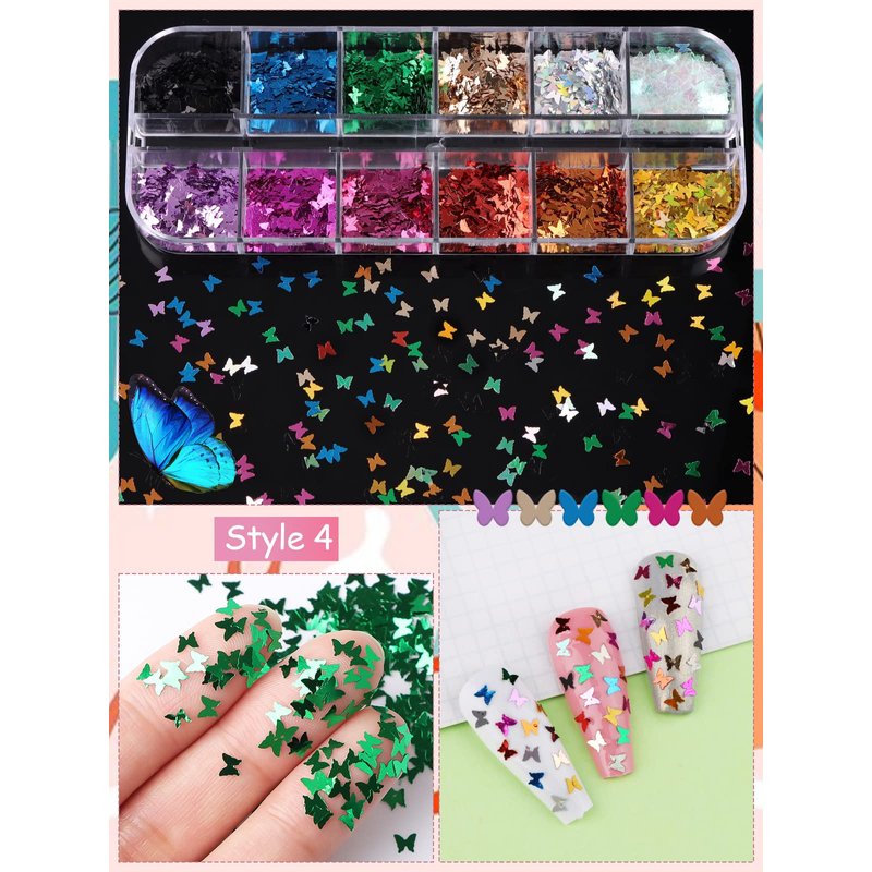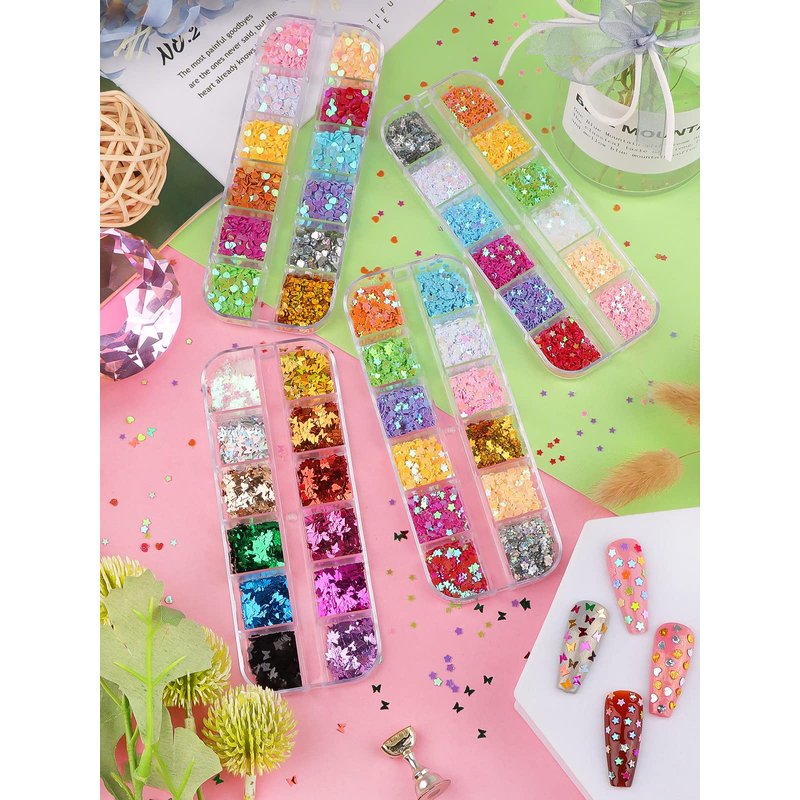 - VARIOUS PATTERNS - 4Boxes with 48 grids of 3D nail glitter. The holographic nail sequins are in different patterns, like star, heart, butterfly and plum blossom, you can choose your favorite one or combine them to meet all your nail art needs.