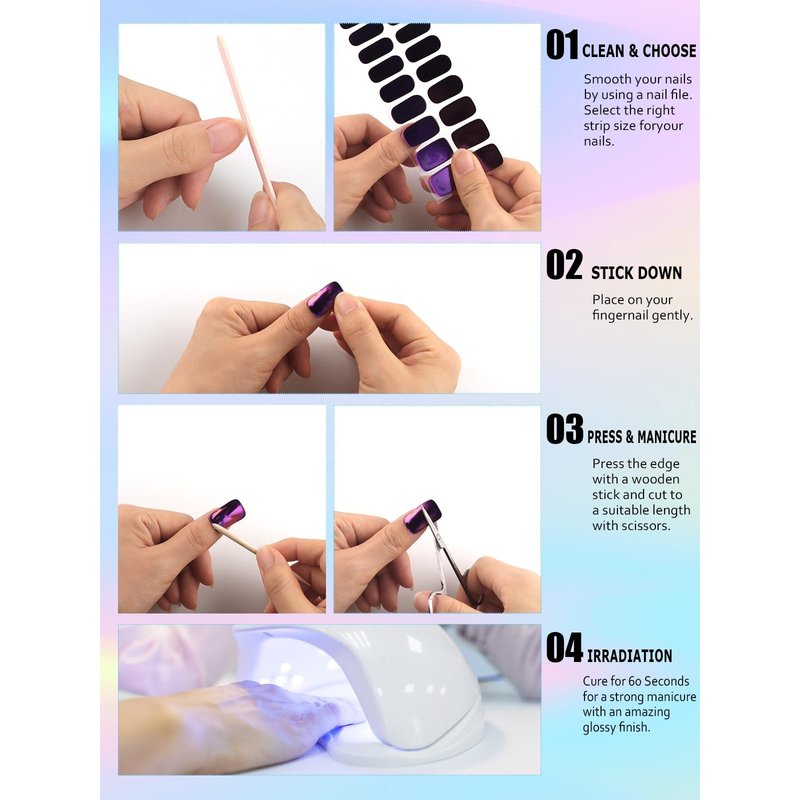 2. The gel nail polish strips are stretchy and flexible, you can easily stretch or trim the various sizes to fit most Toe nail shapes and sizes. 3. After placing them on your nails and curing the remaining 40% with a UV lamp, the gel will completely harden, and the effect will be like applying colorful nail polish in a nail salon.