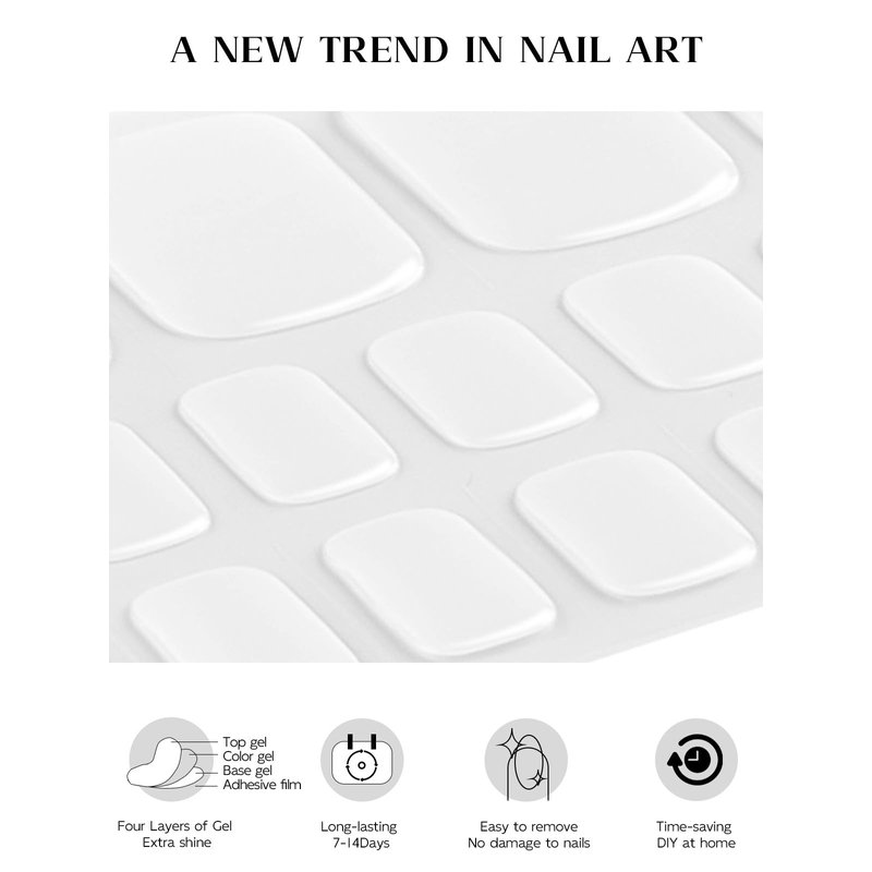- Real gel toenail polish sticker: The gel nail strips are made from real gel nail polish ingredients, not plastic material. No more topcoat is needed as it includes base gel, color gel and topcoat all in one by a unique procedure.