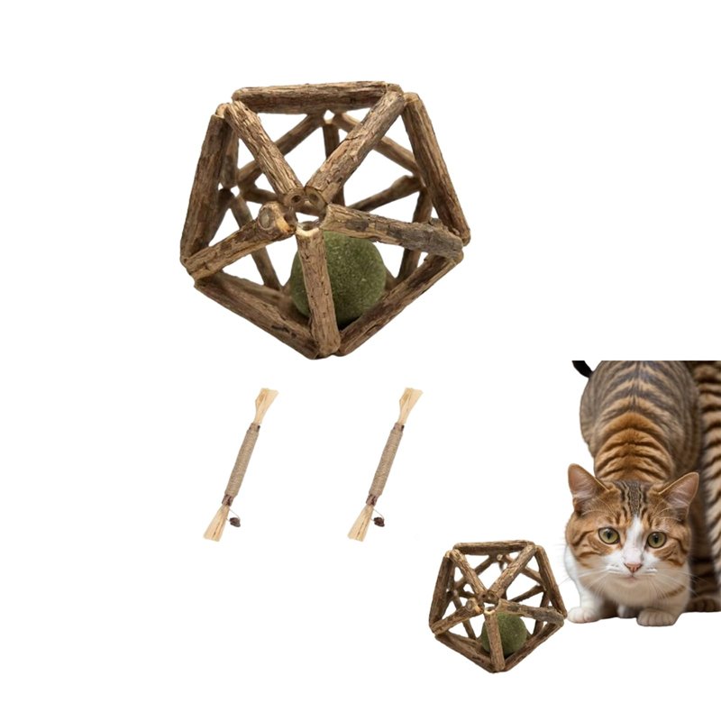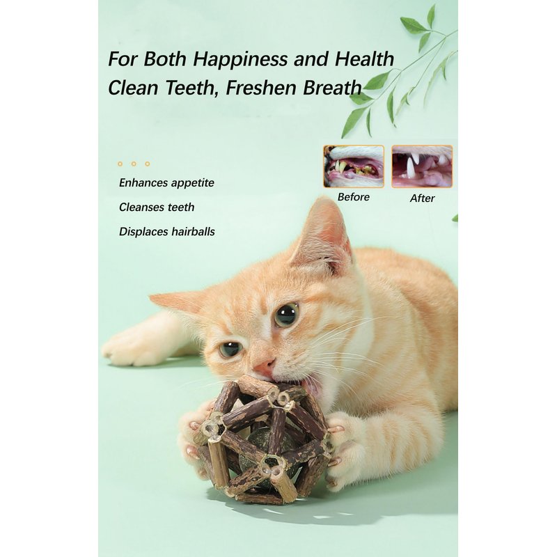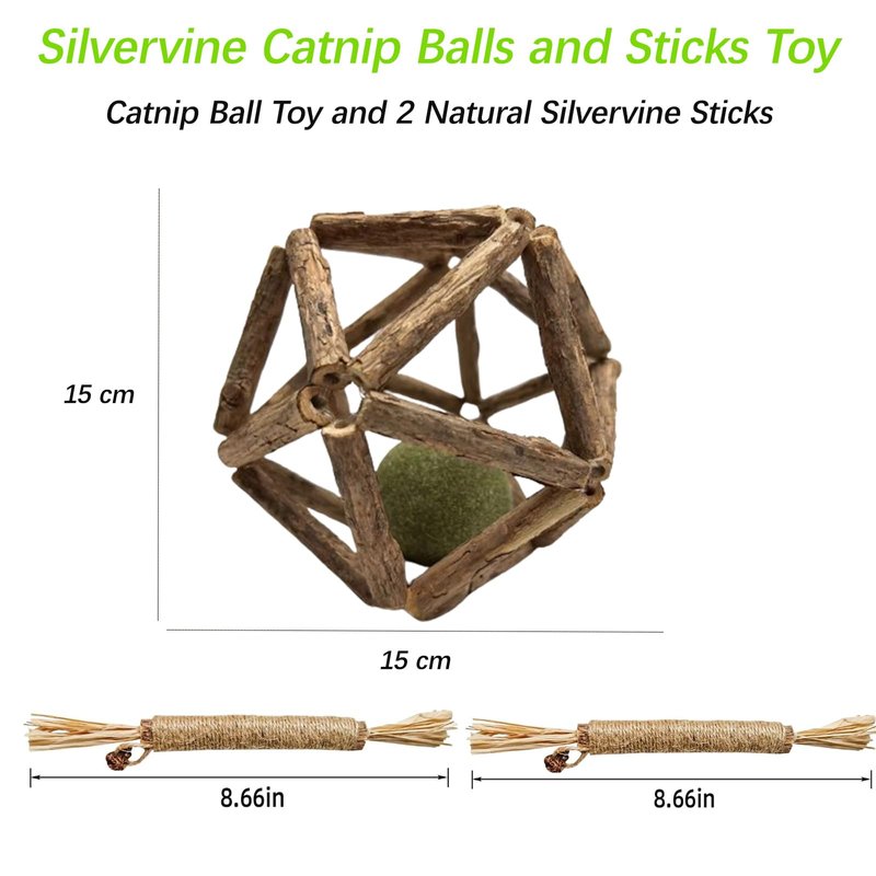 - 2.【Big Catnip Ball Toy Set】 : This huge cat toy ball includes 1*Catnip Ball, 2*Nature Silvervine Stick. The dimensions of the Silver Vine Balls are 5.5*5.5 inches,Nature Silvervine Stick are 8.66 inches . This combination promotes stimulating scratching and chewing activities, addressing both loneliness and dental hygiene for your feline kitten friend.