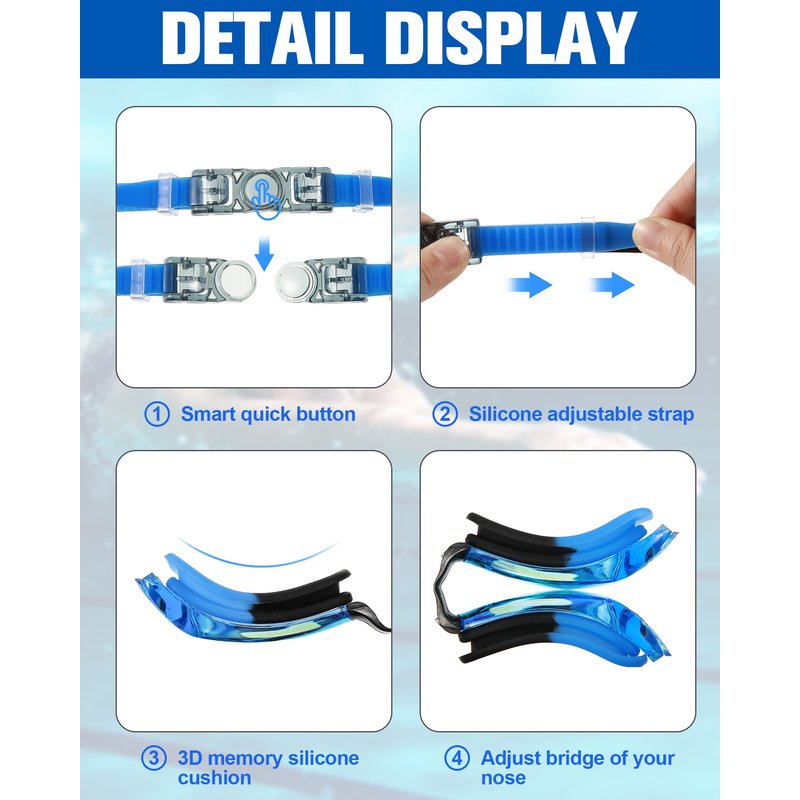- Comfortable and Waterproof: the swimming goggles adopt a silicone cushion seal design, soft and comfortable to wear, fitting different facial shapes, avoiding water to go into your eyes, providing a pleasant wearing experience