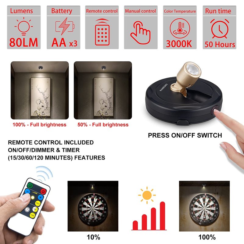 - [Battery Operated & Remote Controlled] - The painting light is wireless and powered by 3 AA batteries (not included). Long lasting super bright LED, 80 Lumens, 3000K warm white, no additional wire is needed. The remote can control the lights within 18 ft, very handy and easy to operate.