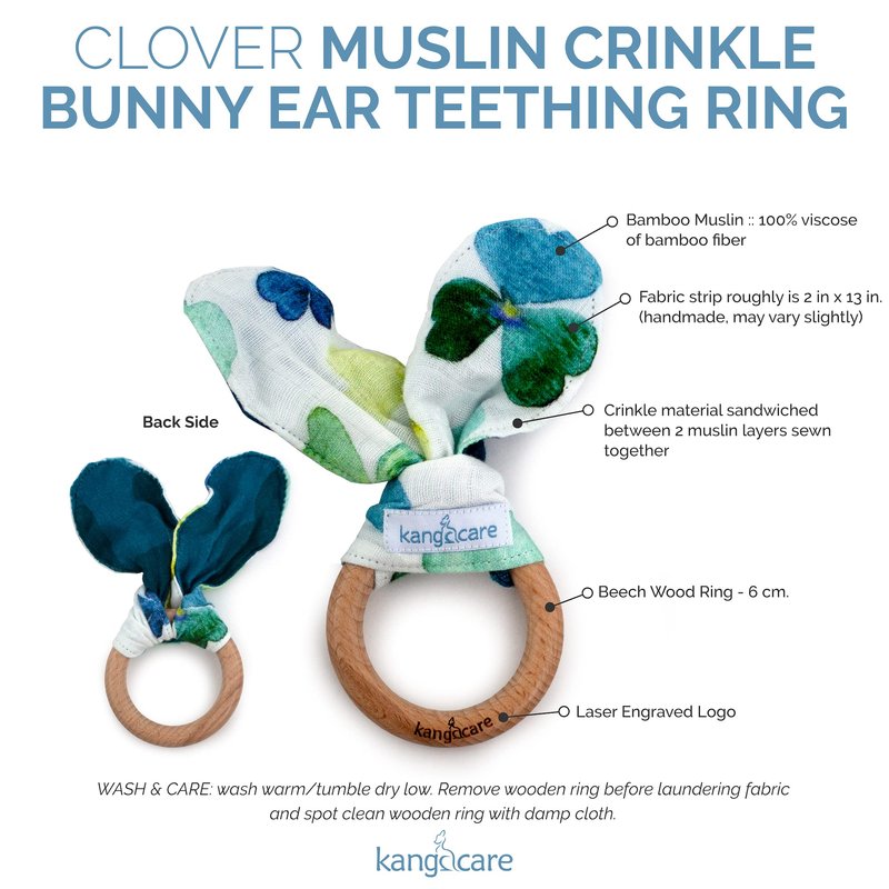 Kanga Care Baby Soft Muslin Sensory Crinkle Bunny Ear Wood Teething Ring - Clover Leaf