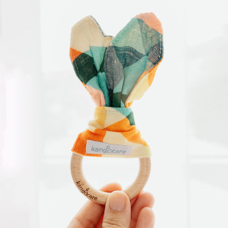 Kanga Care Baby Soft Muslin Sensory Crinkle Bunny Ear Wood Teething Ring - Finn Geometric