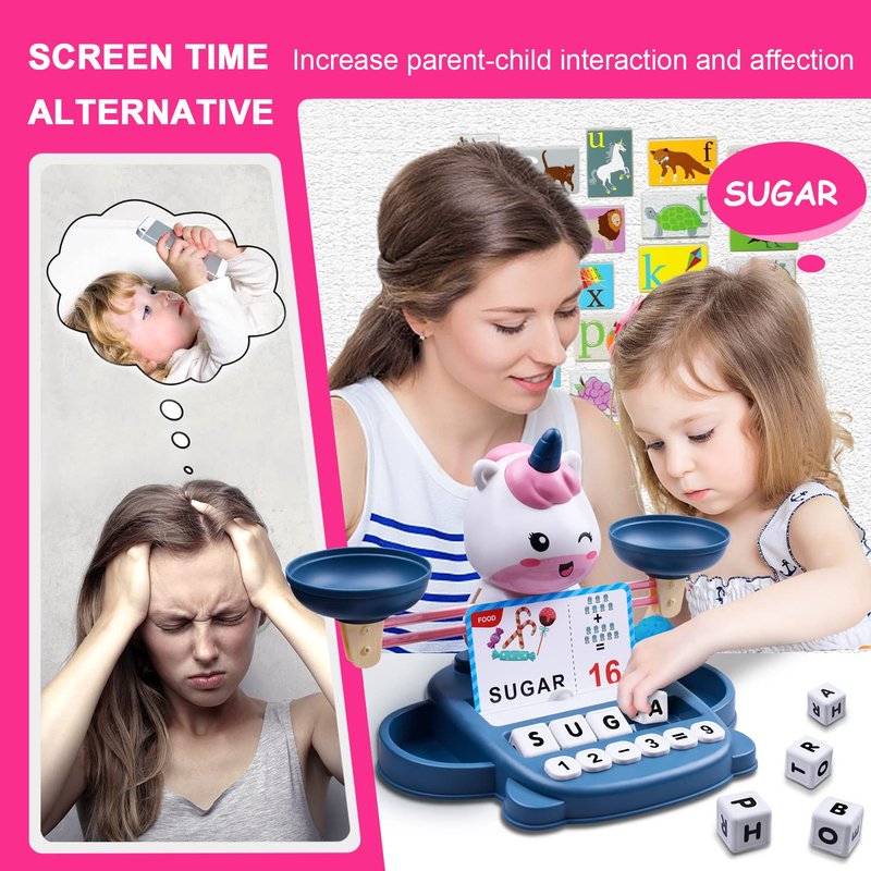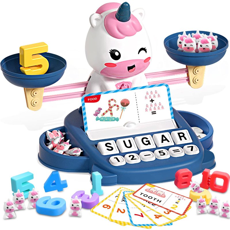 - Unicorns learning & educational toys : Package contains 1 balance, 2 trays, 10 colorful digital weights, 20 small unicorn weights, 32 cards (4 colors in total, containing 64 words, 3, 4 and 5 letter words), 10 letter cubes and 25 number blocks .Learning & educational toys for 3 4 5 6 7 year old.