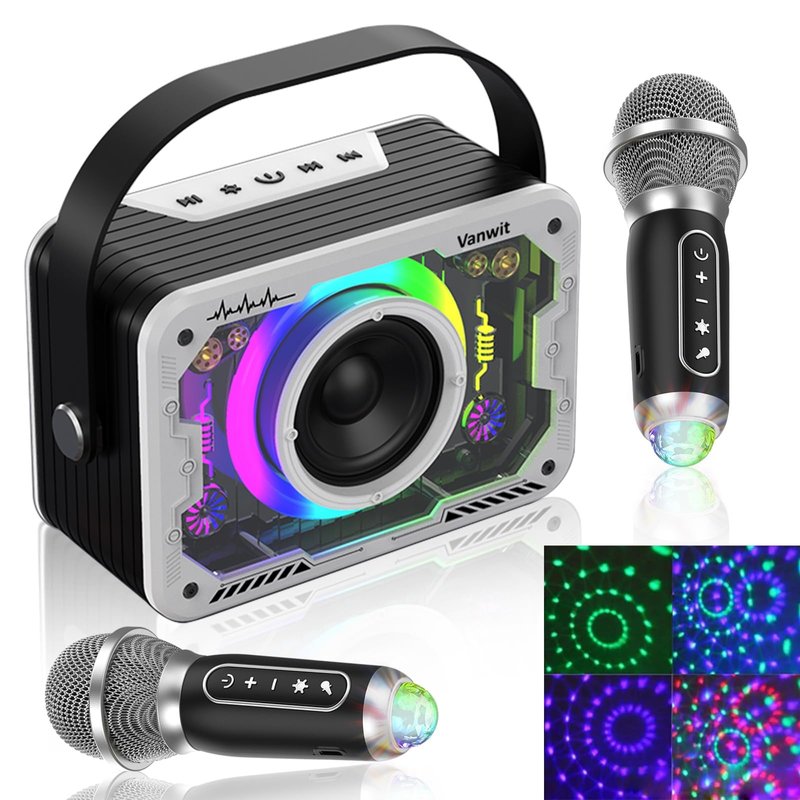 - 【All-in-one Functionality】Vanwit karaoke machine offers an all-in-one entertainment system, featuring built-in HD stereo sound quality with upgraded full-frequency speakers, two wireless microphones for duets, easy button control, flashing LED lights, and disco party lights. It supports AUX-IN/USB/TF connectivity.