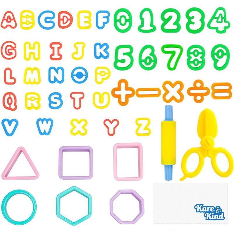 Kare & Kind Dough Tool Kit - 49 pcs Multi-Color Clay Dough Tools - Letters, Numbers and Basic Shapes - for Kids, Toddlers, Pre-School - Excellent Party Giveaways, Christmas, Birthday GIF