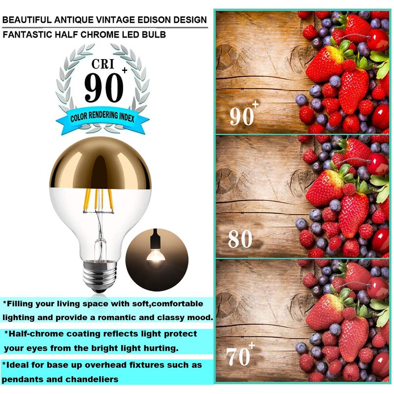 The half chrome light bulb 60 watt has a gold tipped top to help direct the light and to beautifully reflect its surroundings. It’s perfect decorative light bulb to cut down the glare. It keeps the glare out of you eyes and saves your eyes. It does not hurt like the Edison light bulbs tentative to you.They are perfect for dining room drop-down/downward facing light fixtures and bathrooms etc.