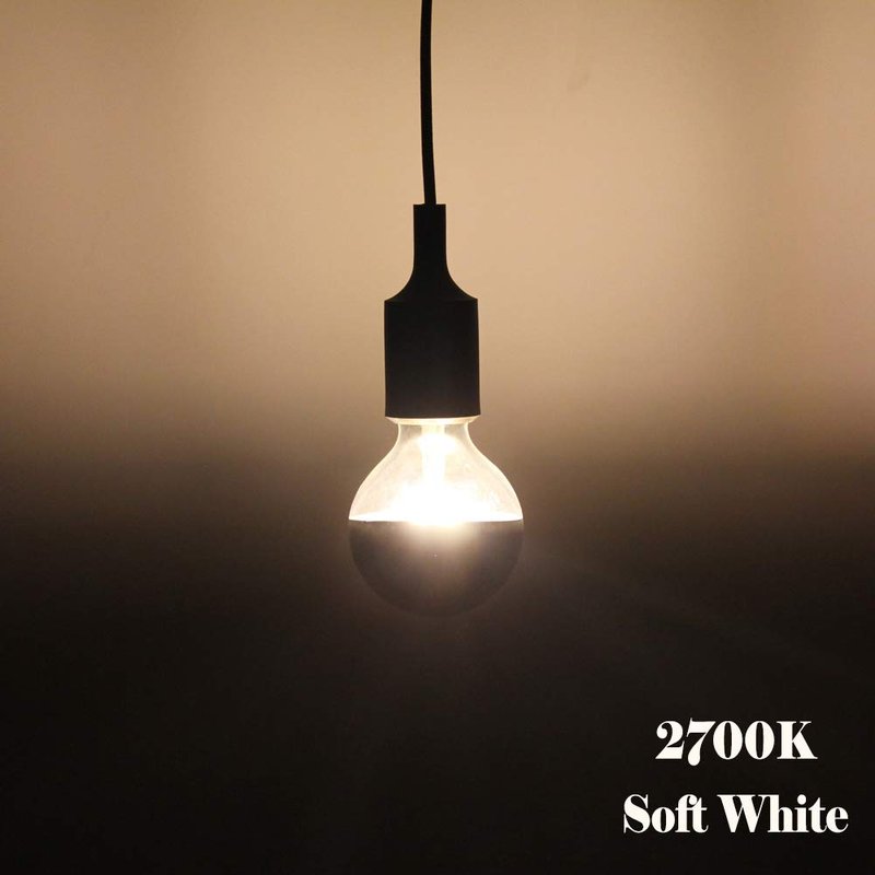 - ✔Light Output: 600 lumens - 6W LED (60 watts Equivalent) - 2700 kelvin (warm white) - 2,0000 hour bulb life. Please note, these half mirror led light bulbs are not as bright as modern bulbs of the same wattage and are recommended for exposed socket fixtures.