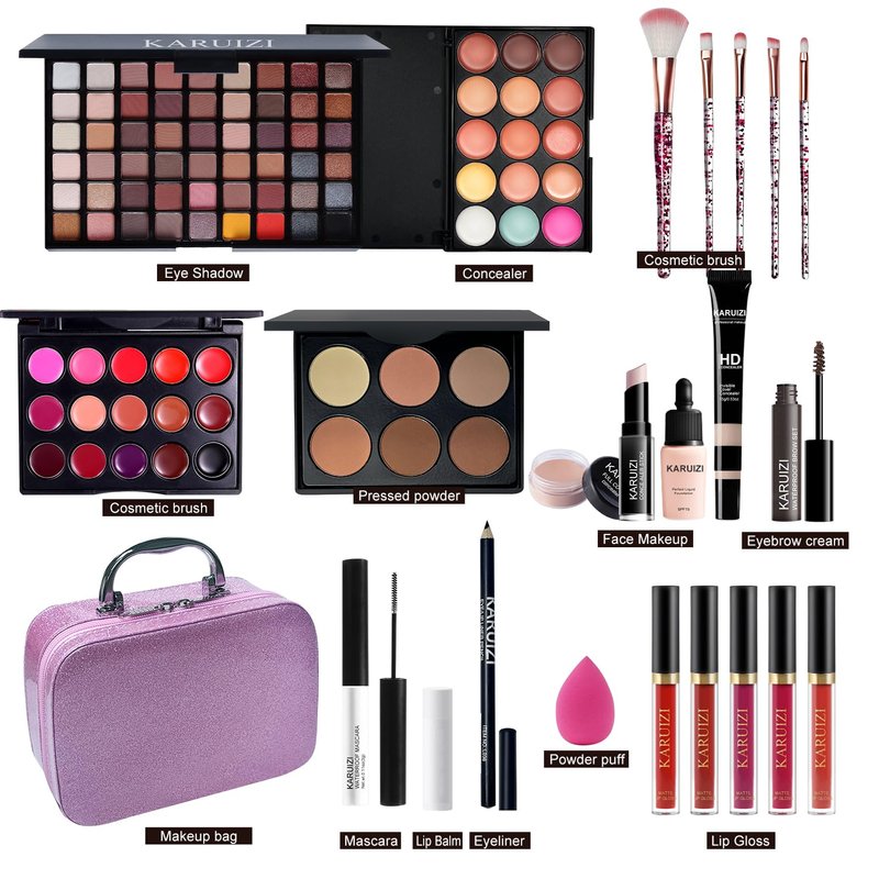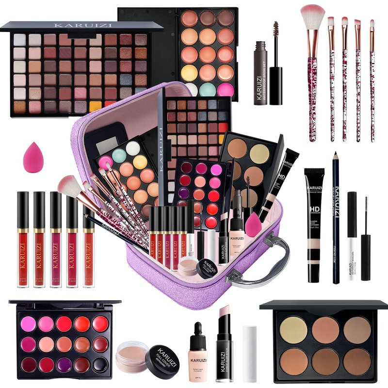 Elevate your makeup game with this comprehensive KARUIZI makeup kit! This all-in-one set has everything you need for a flawless look, from eyeshadow palettes in a dazzling array of colors to lip glosses that add a perfect pop of shine. The kit includes makeup brushes with soft, high-quality bristles for effortless application, and a convenient storage bag to keep your essentials organized. Whether you're a makeup novice or a seasoned pro, this versatile kit offers endless possibilities to create stunning looks for any occasion. With KARUIZI, you can experiment with bold and vibrant shades or opt for a more natural, understated style. Achieve your desired look with ease, all while enjoying the convenience of having your favorite makeup products in one place. Indulge in this comprehensive makeup collection and unlock your inner makeup artist!