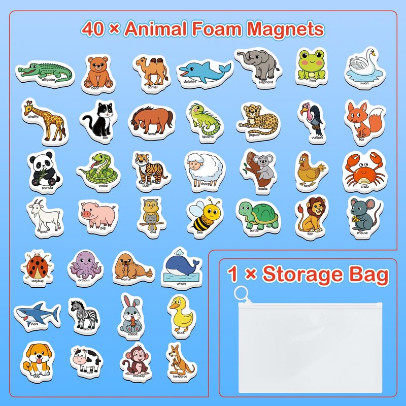 - 【Fridge Magnets for Toddlers】Animal magnets set contains 40 animal magnets and 1 storage bag. Bright and cute magnetic foam objects can attract children's eyes and keep their attention, which can help them have fun while learning animal words.