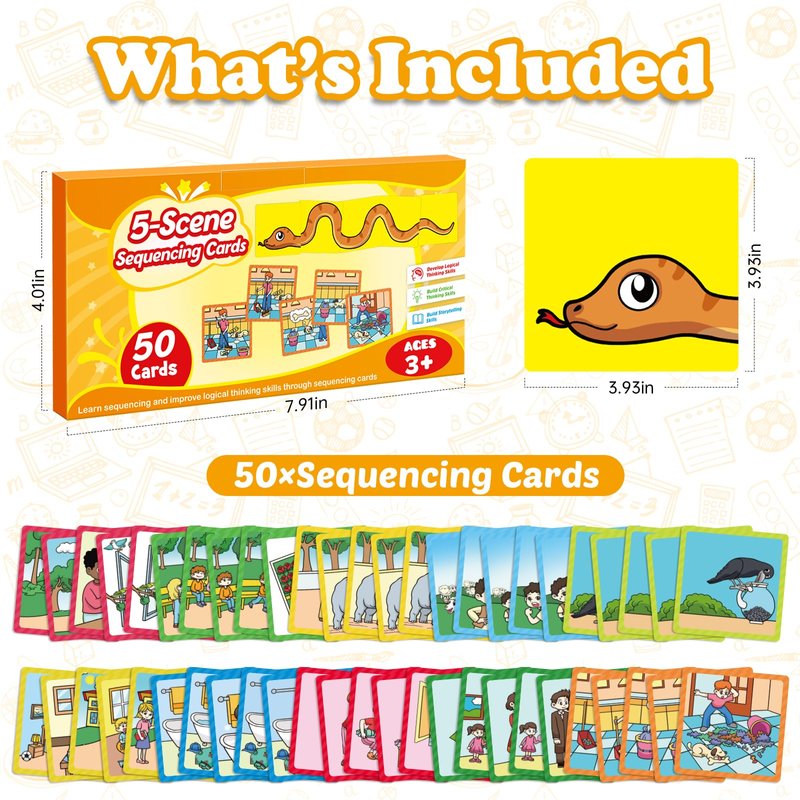 - 【What’s Included】 You will get 50 sequencing cards, with every 5 cards logically forming a common story, for a total of 10 fun stories. Perfect for learning through play. The size of the card is 3.93in*3.93in. Vivid illustrations can capture kids’ attention.
