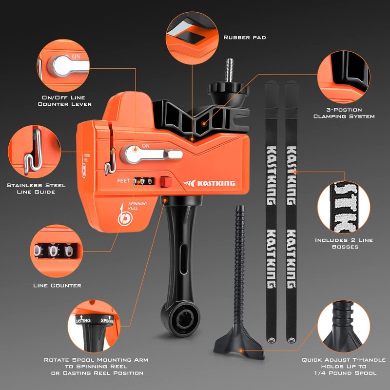 - PATENT PENDING LINE SPOOLING TOOL– The innovative KastKing patent pending line spooler tool design is simple to use and can spool both spinning reels and baitcasting reels without line twist. The 3-position clamping system can be adjusted to fit nearly any size rod (0.15 to 1.0 inches in diameter) and tension bands can be adjusted to apply the ideal line tension during the spooling process.