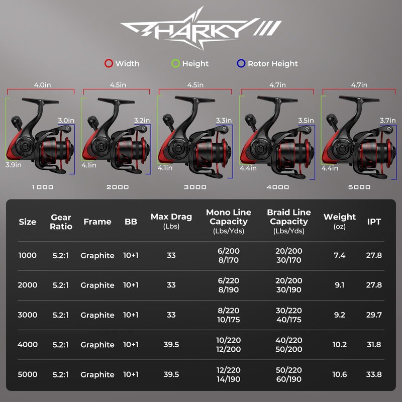 - PURE POWER - You will love Sharky III spinning reel's amazing best-in-class up to 39. 5LBs / 18KG of smooth, reliable triple disc carbon fiber drag, oversized stainless-steel main shaft, and stronger precision mesh manganese brass pinion gears.