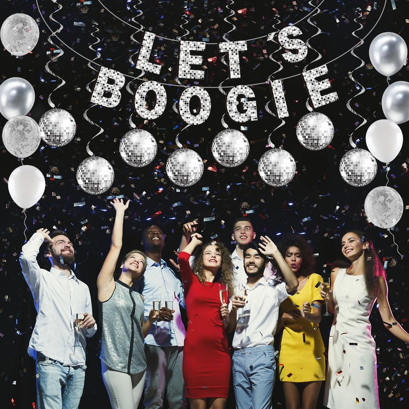 - Let's Boogie: we have the [Let's Boogie] banner, made of quality paper in silver color, which can be easily strung together and hung using the string included in the package; This is a fun and festive disco decoration that will set the tone for your disco theme party; Hang it up as a backdrop for photos or above the dance floor to keep the party going all night long