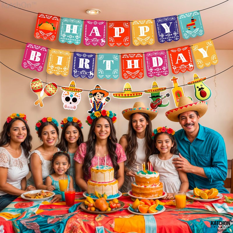 KatchOn, Fiesta Happy Birthday Banner - 15 feet, 3 String | Cinco De Mayo Theme, Mexican Fiesta Pinata Sombrero Garland for Mexican Birthday Party Decorations | Mexican Banner Fiesta Party Decorations