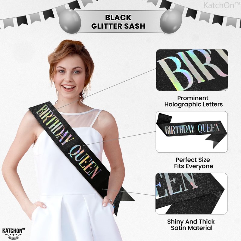 - 63X4 INCH | EXQUISITE HOLOGRAPHIC BIRTHDAY QUEEN AND CROWN SET - Celebrate your special day in style with our exquisite Birthday Queen Crown and Sash set! This stunning birthday sash and tiara is the perfect way to make your Black and Holographic birthday decorations for women truly unforgettable. Enjoy your day with birthday crown and sash for women and standout along the crowd as you celebrate your birthday party. The happy birthday sash for women is comfortable and adjustable to your size.