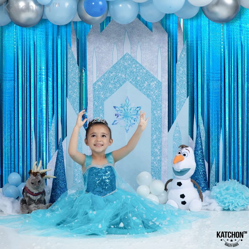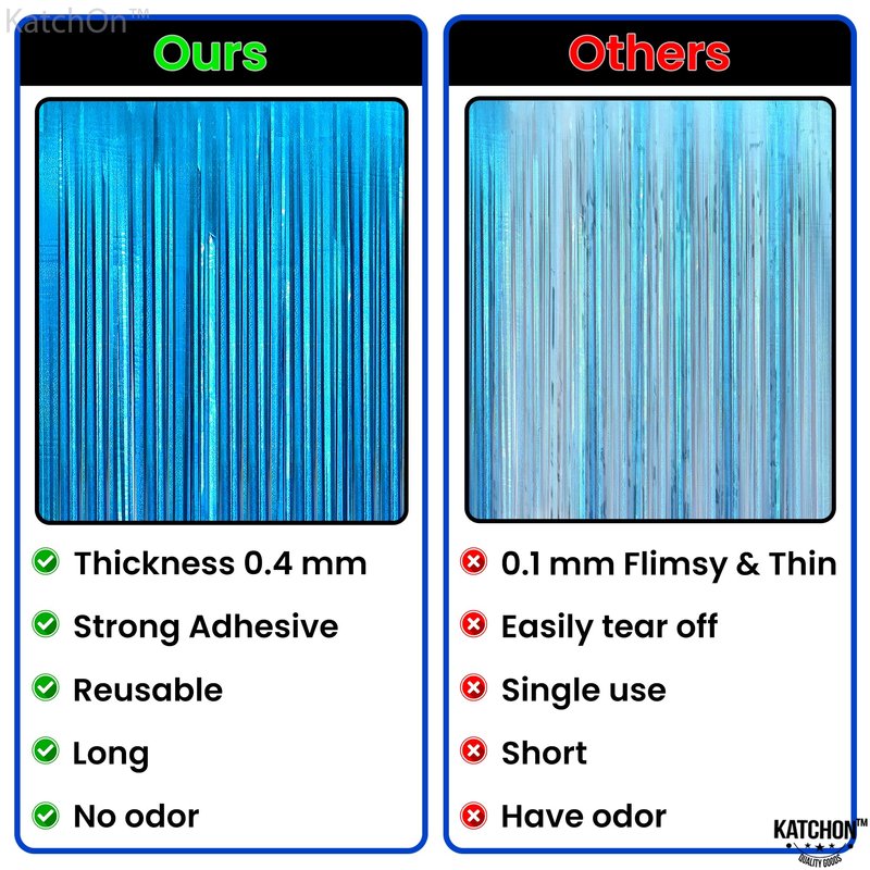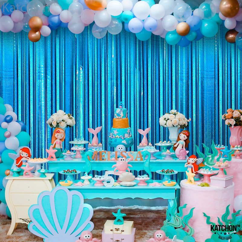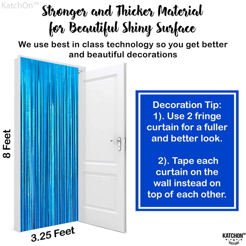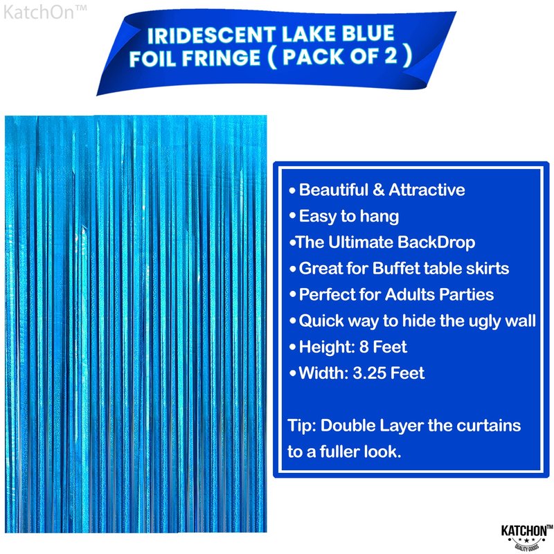 - STURDY AND DURABLE | REUSABLE – This Fabulous katchon iridescent lake blue fringe backdrop is best for ocean party decorations. Durable enough to be re-used on the beach themed party decorations. Easy to keep and store. Inexpensive value with premium quality foil material blue streamers. Also the cut of foil fringe curtains is pretty wide, it won't easily strip down. This teal tinsel backdrop is reusable for many occasions like, birthday, baby shower or bachelorette, beach party decorations.