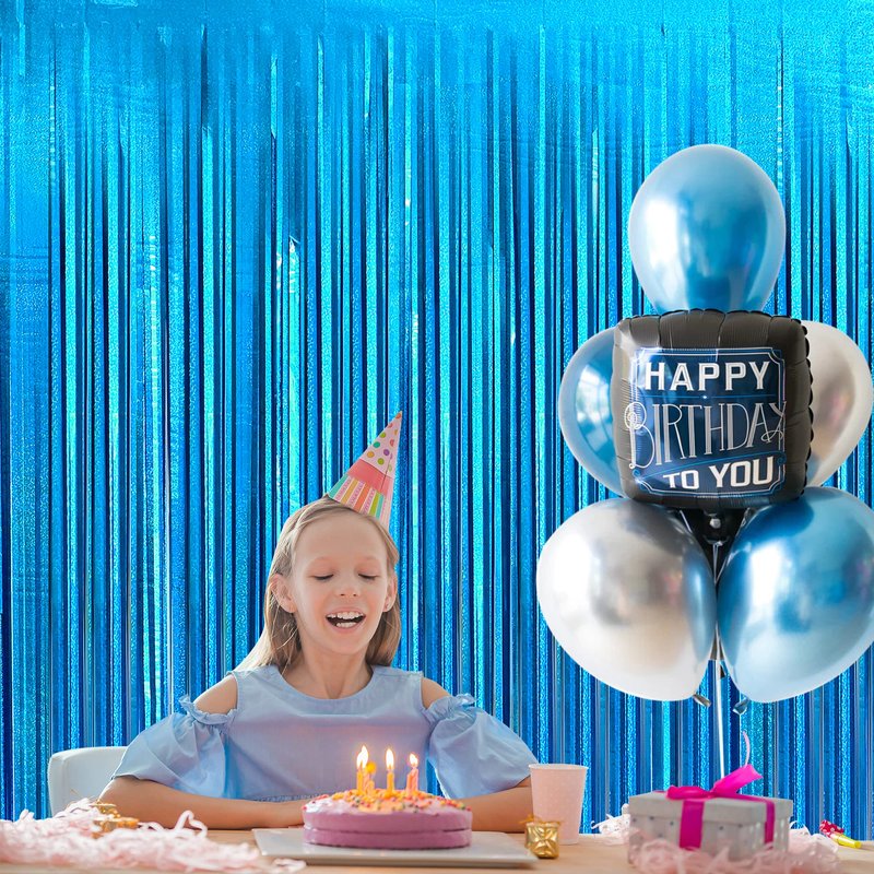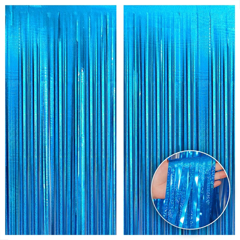 - XTRALARGE 6.4X8 FEET | PACK OF 2, BLUE FRINGE BACKDROP – Thinking about what to add on your party backdrops? This package contain pack of 2, lake blue streamers with size of xtralarge 6.4x8 feet, it will be a most highlighted item in all different occasions. This fabulous iridescent Lake Blue streamers, you can make an elegant entrance blue fringe curtain for your guests. Let them be amazed with great blue tinsel backdrop for blue streamer backdrop party decorations, summer party decorations