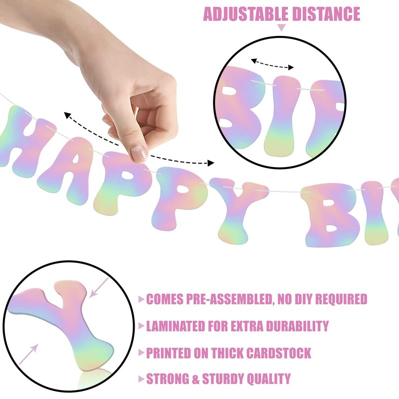 2) The spacing between the letters of the iridescent happy birthday banner can be adjusted according to your taste. Innovate according to your style and choice. The length can be adjusted, too.