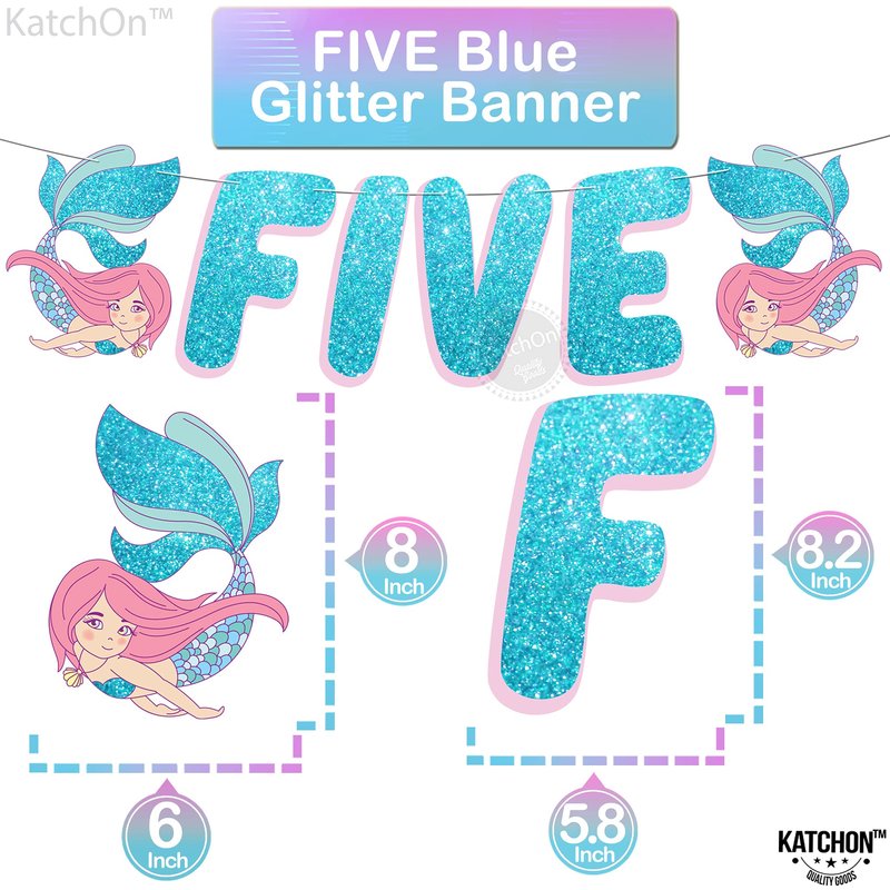 - 🧜♀️ GLITTER | PRE-STRUNG BANNER | PERFECT SIZE - You’ll enjoy this budget-friendly glittery mermaid theme party decoration. A beautiful Mermaid Birthday Decorations for girls 5 year old are also great for playtime. Save your time and money as you get the assembled Five letter banner with mermaid 5th birthday balloons and ready to hang with mermaid decorations for birthday party 5. So add these to under the sea party decorations, and mermaid birthday party supplies.