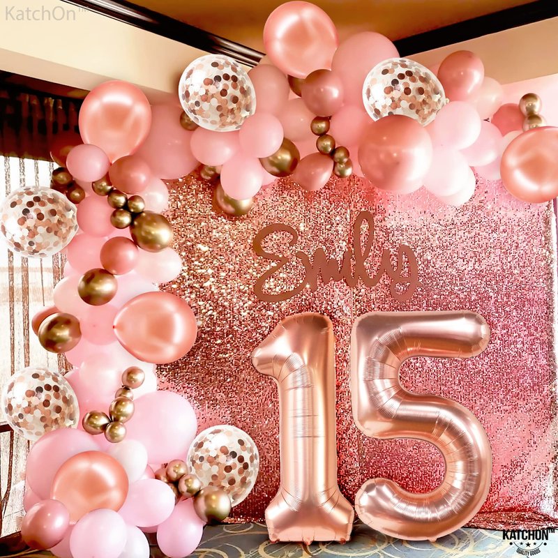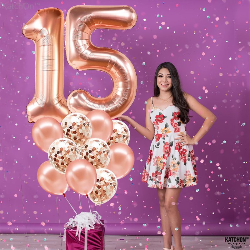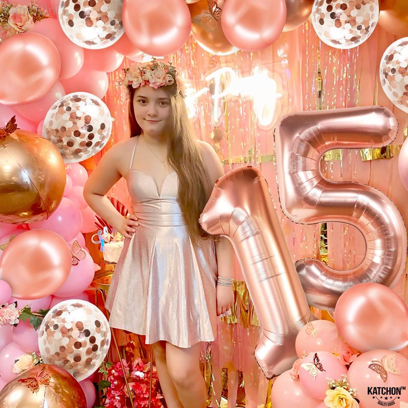 - LARGE SIZE - 40 INCH | WITH SET OF CONFETTI BALLOONS – Looking for birthday decorations for 15 year old girl birthday decorations that will match little angel’s Rose gold princess-themed decoration for Sweet 15th Birthday Decorations for Girls? This Giant 15 balloon number comes with Rose Gold Number 1 & 5 Balloons, Pack of 5 Real Rose Gold Balloons & Pack of 5 Rose Gold confetti balloons to complete katchon Rose Gold 15 Balloons birthday decoration. This 15 numbers for quinceanera.