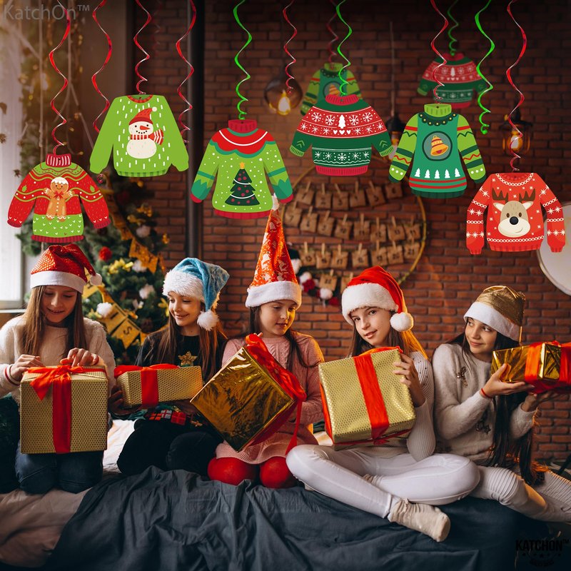 - WIDE APPLICATION : This Christmas mylar swirl is a great ceiling decor for christmas party hanging swirls, ugly sweater birthday decorations, ugly christmas sweater party decorations, ugly sweater theme party or ugly sweater decorations for party. These ugly christmas sweater decorations are impressive for adding a bit of surprise to your Christmas ceiling hanging decorations. Create a special day with these ugly sweater party decorations for christmas.