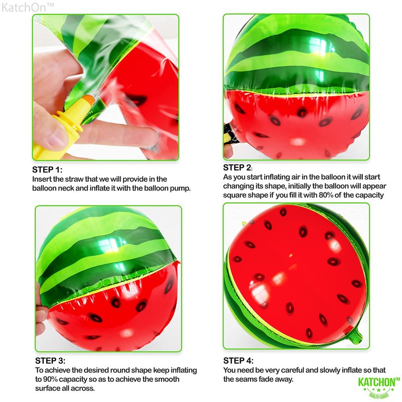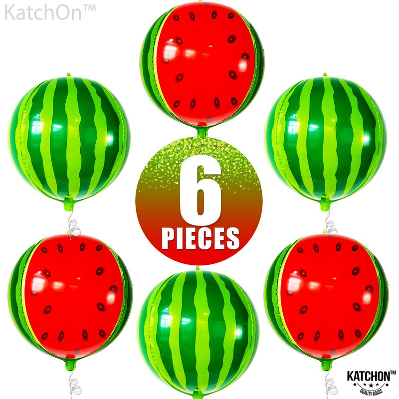 - CREATE EXOTIC ONE IN A MELON PARTY : If one Fruit mylar balloons can create such a splendid effect then we have got you 6 of these Large watermelon first birthday balloons. No need of extra operating; there is a small hole on the top of the balloon to hang; in order to allow customers to better decorate these round watermelon mylar balloons, set comes with a roll of ribbon for tropical birthday party decorations, end of summer party decorations, luau decorations, beach party decoration.