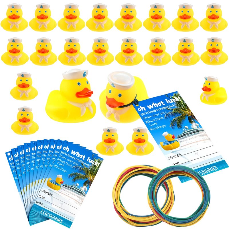 Kathfly 60 Pcs Cruise Ducks Tag Kits include 20 Rubber Cruise Ducks for Cruise Ships, 20 Cruising Rubber Duck Tag Cards, 20 Rubber Bands for Hiding Carnival Party Game Ducking Carnival Cruise Supplies