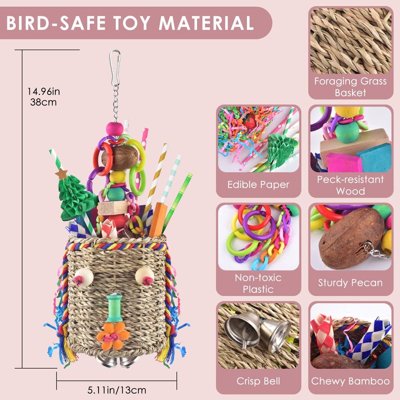 - ENRICHMENT BENEFITS: The budgie foraging basket with various texture toys will not only entertain with its fun to tear and chew block beads, bamboo decors, nuts and confettis, birdies also enjoy the physical activities of hanging, swinging and spinning by griping the basket