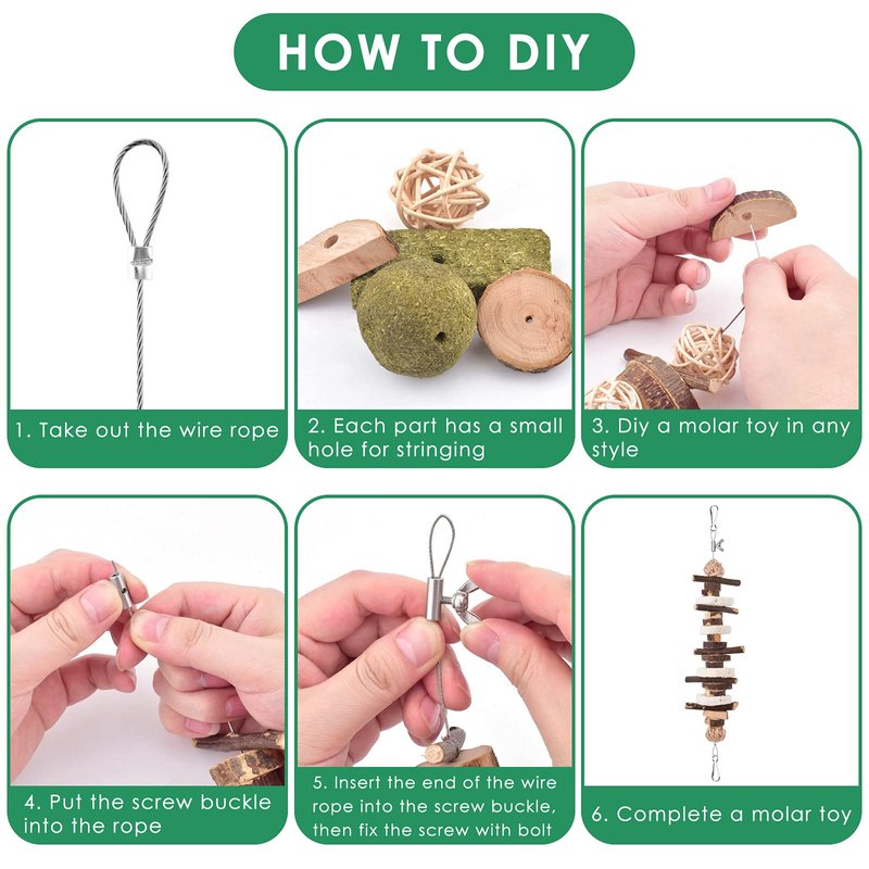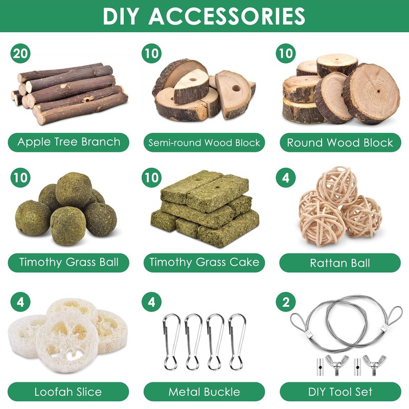 - Packing List: The guniea pig toys set contains 20 Apple Wood Sticks, 10 Semi-round Wood Blocks, 10 Round Wood Blocks, 10 Timothy Grass Balls, 10 Timothy Grass Cake, 4 Rattan Balls, 4 Loofah Slices, 4 Metal Active Hooks and 2 DIY Tool Sets. Enough gerbil toys accessories for funny diy into funny styles.